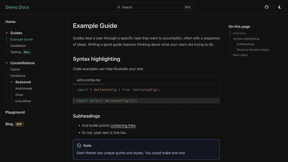 A theme is a Starlight plugin that changes the visual appearance of a site with custom CSS, component overrides, or other new features.